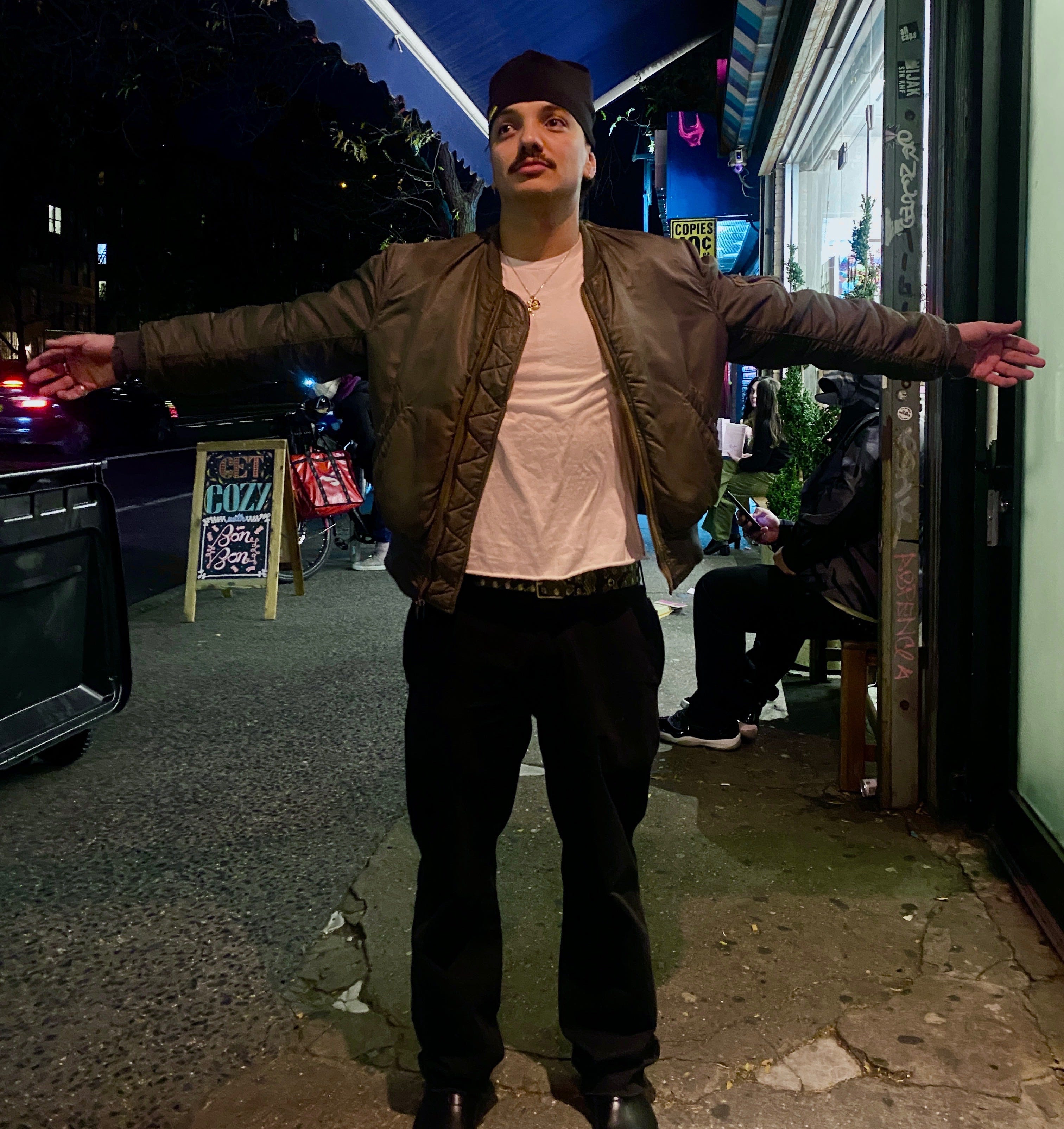 T: Having a moment. Calvin Klein white tees—always. I got this bomber jacket off eBay. Uh, I didn’t realize how fucking trash it was [he began to direct us to the stringy, torn, and ripped-up cuffs, bearing the wear and tear only possible from years of love]. And I don’t really know how I feel about it. I guess I should’ve just actually looked at the photos. But whatever.